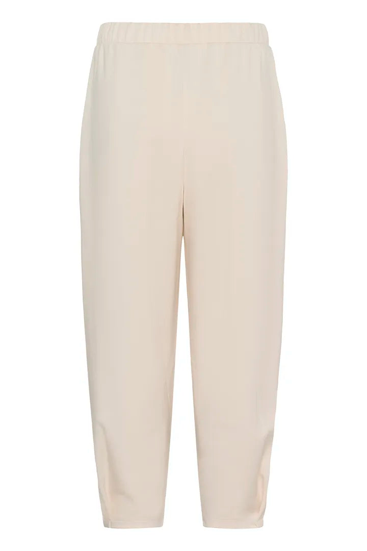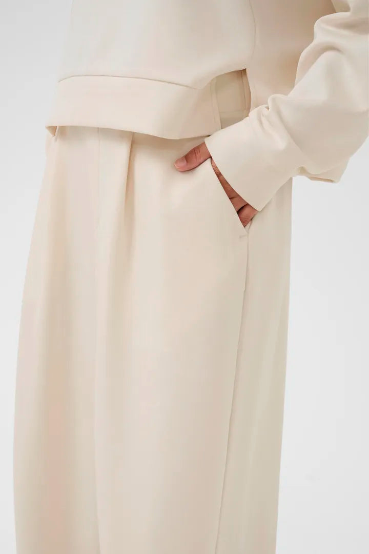 Tässä Housussa on moderni ja minimalistinen siluetti. Lahje kavennettu kauniilla saumalla. Vyötärö korkea jossa kuminauha ja pienet laskokset. Housussa taskut. Materiaali ihanan kevyt pehmeä laskeutuva ja ylellinen, joten voi pukea sen monella tavalla moneen menoon.