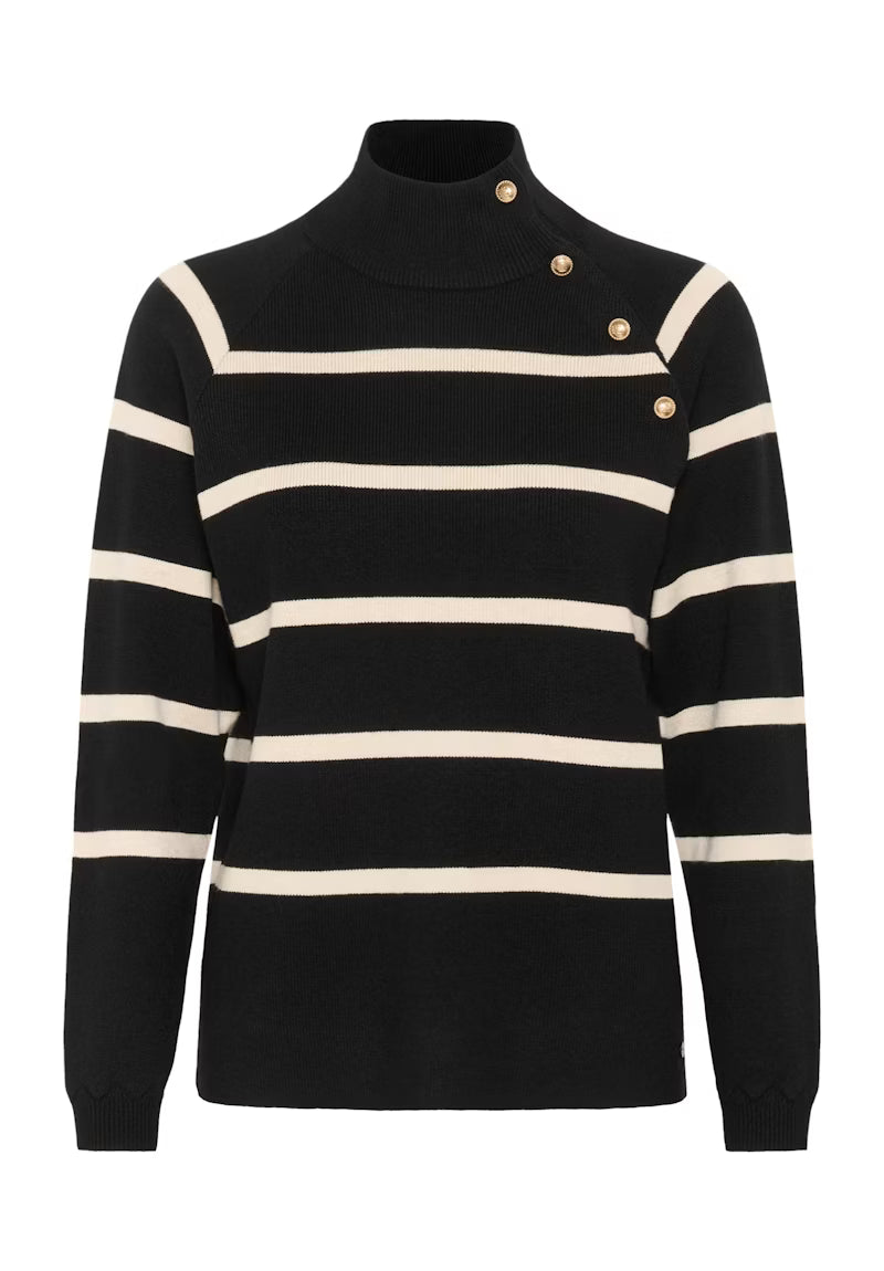Neuleessa on matala poolokaulus ja kauniit kultaiset napit jotka menee vinottain kauluksesta kainalo linjaan. Neuleeseen on saatavilla myös hame kahdessa eri värissä.