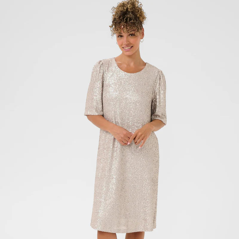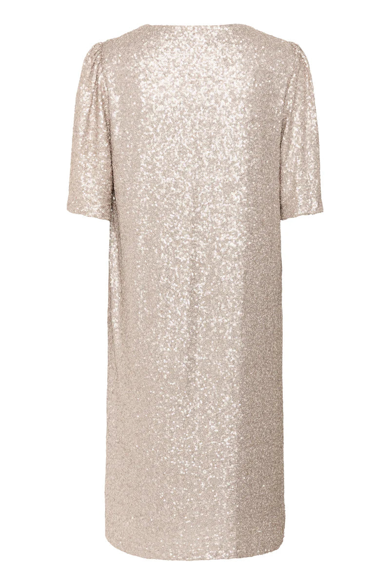 Tässä upea shampanjan värinen paljettimekko joka laskeutuu kauniisti. Hihat ovat puolipitkät ja mekossa on myös vuori.