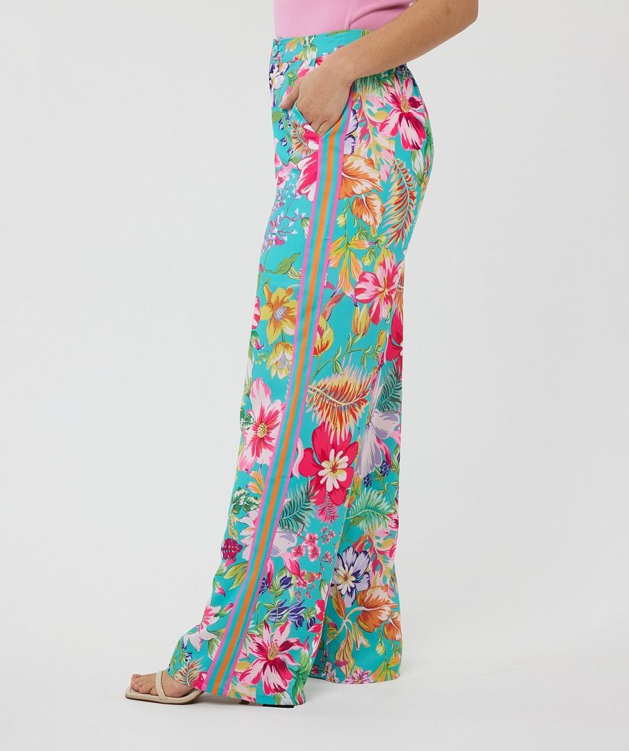Näissä kauniissa kukkahousuissa on yksityiskohtana värikkäät puntin sivuissa. Tähän kesähousuun on kiva yhdistellä erivärisiä kesätoppeja yläosaksi.