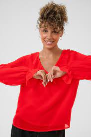 Upea kirkas punainen sifonkipaita missä kuultaa hihoista iho läpi, muuten paita on vuoritettu. Hihansuissa kuminauhat ja kauluksessa kaunis frilla.