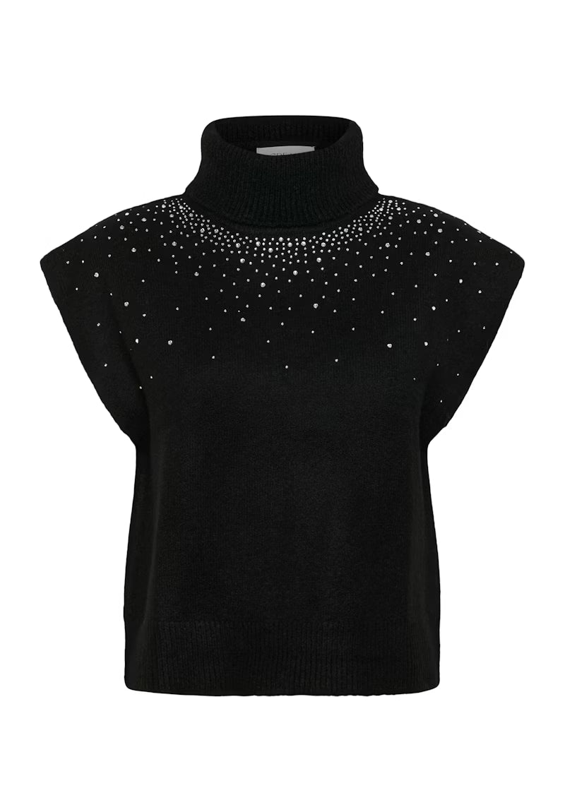 Musta slipover-tyylinen neule. Neuleessa on korkea poolokaulus ja paljon timantteja kauluksen ympärillä. Ihanan kimalteleva lisä syksyn ja talven asuihin. Neule on hihaton ja suoran mallinen.