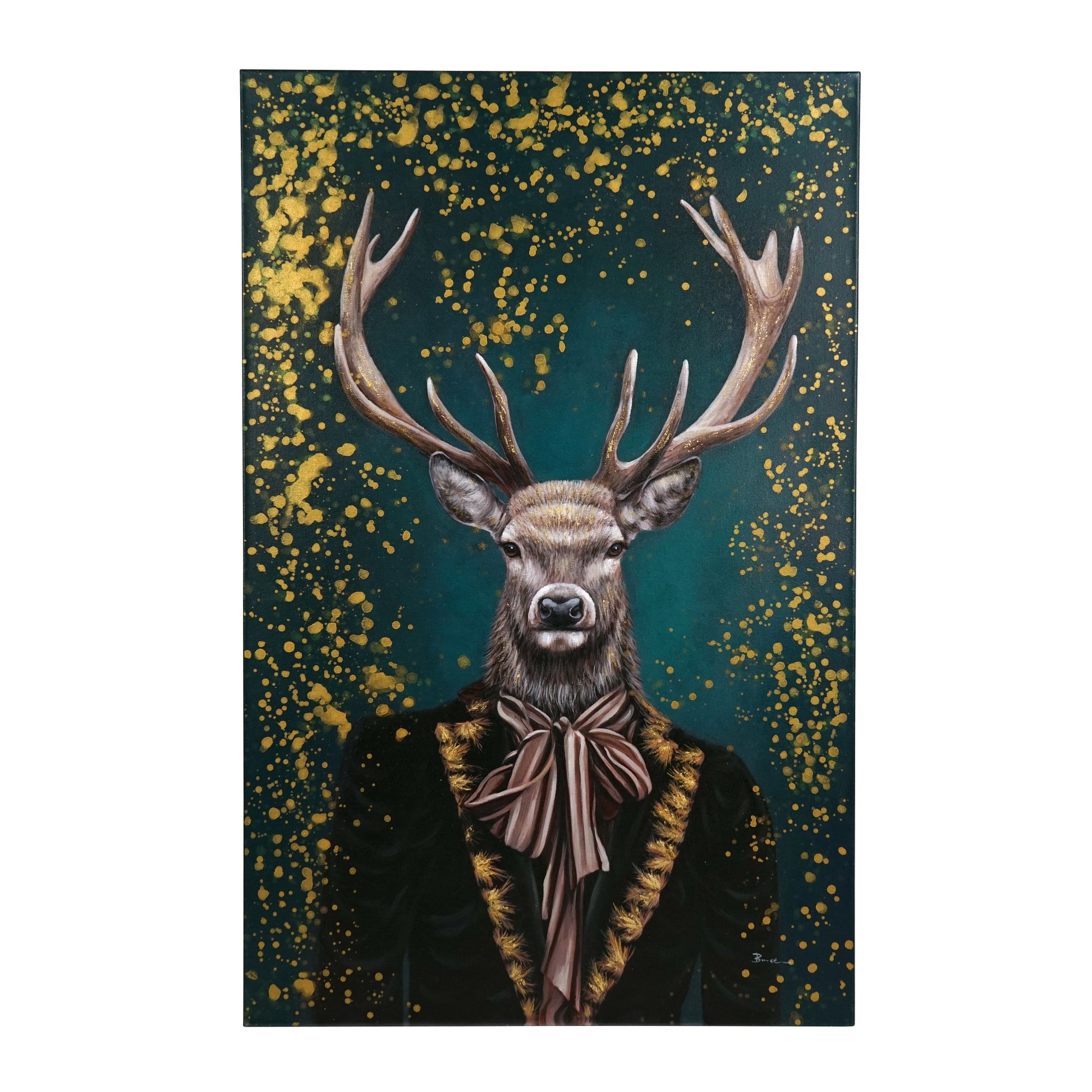 Tämä suuri hirvitaulu on näyttävä lisä sisustukseesi: Taulu on käsinmaalattu. Siinä on takkiin puettu hirvi, joka katsoo katselijaa mystisesti.