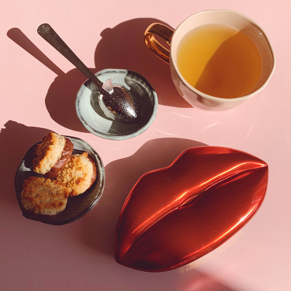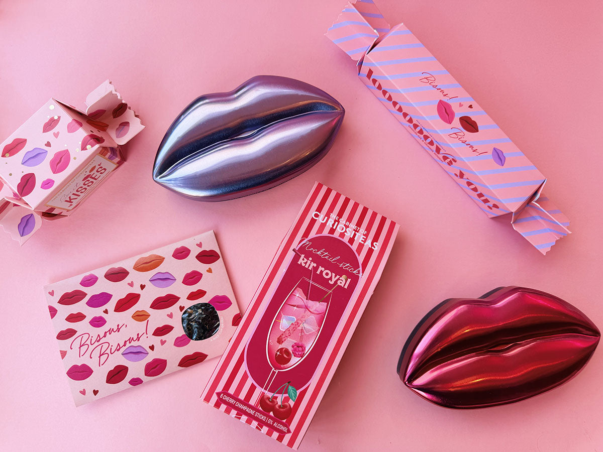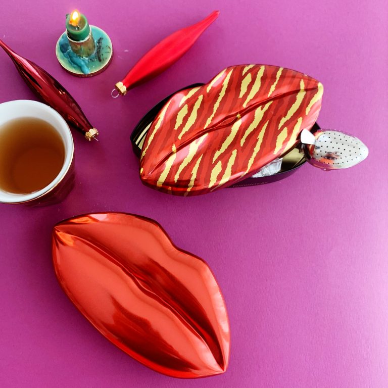Kaunis huulten muotoinen lahjapakkaus sisältää teehaudukkeen sekä teesihdin.