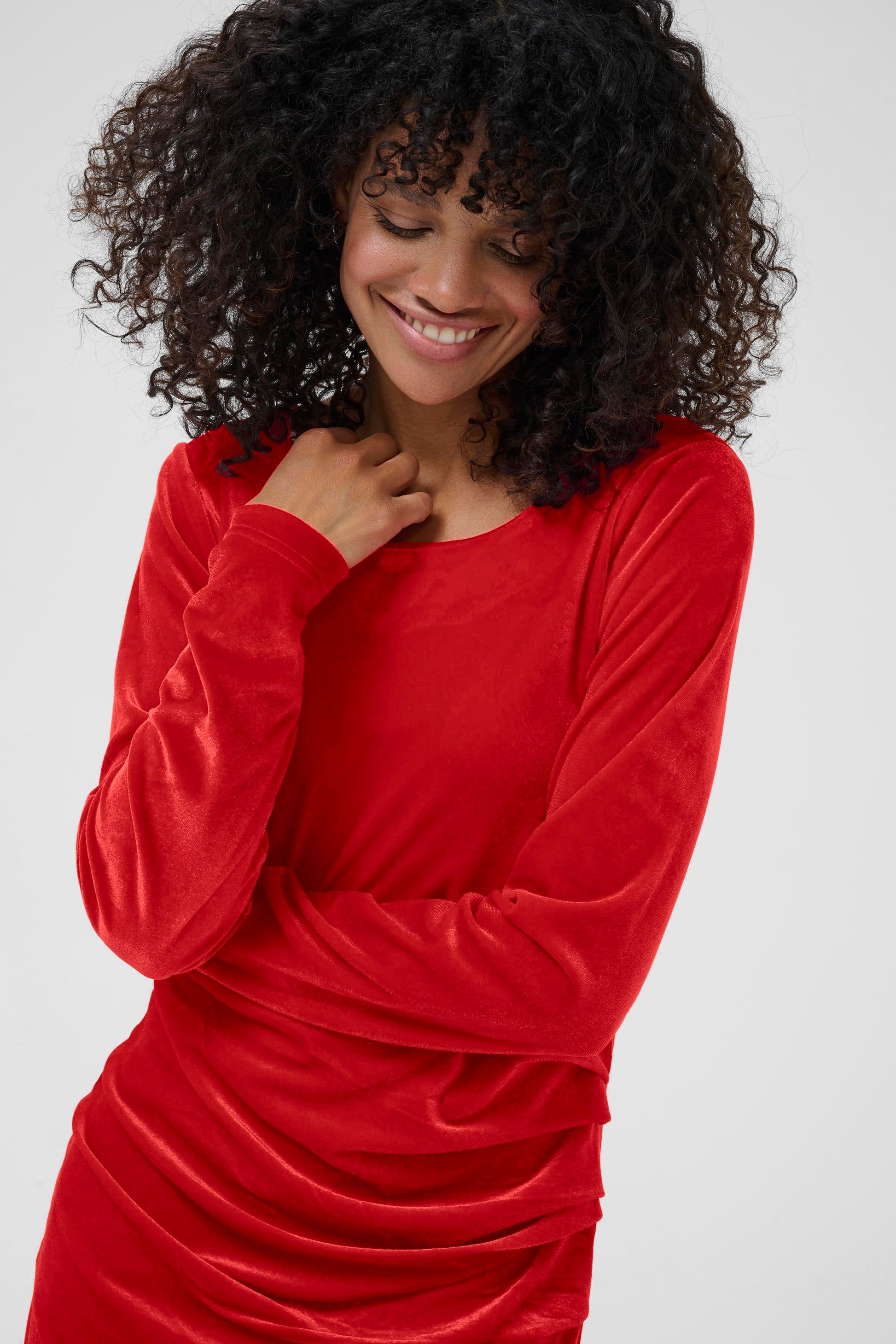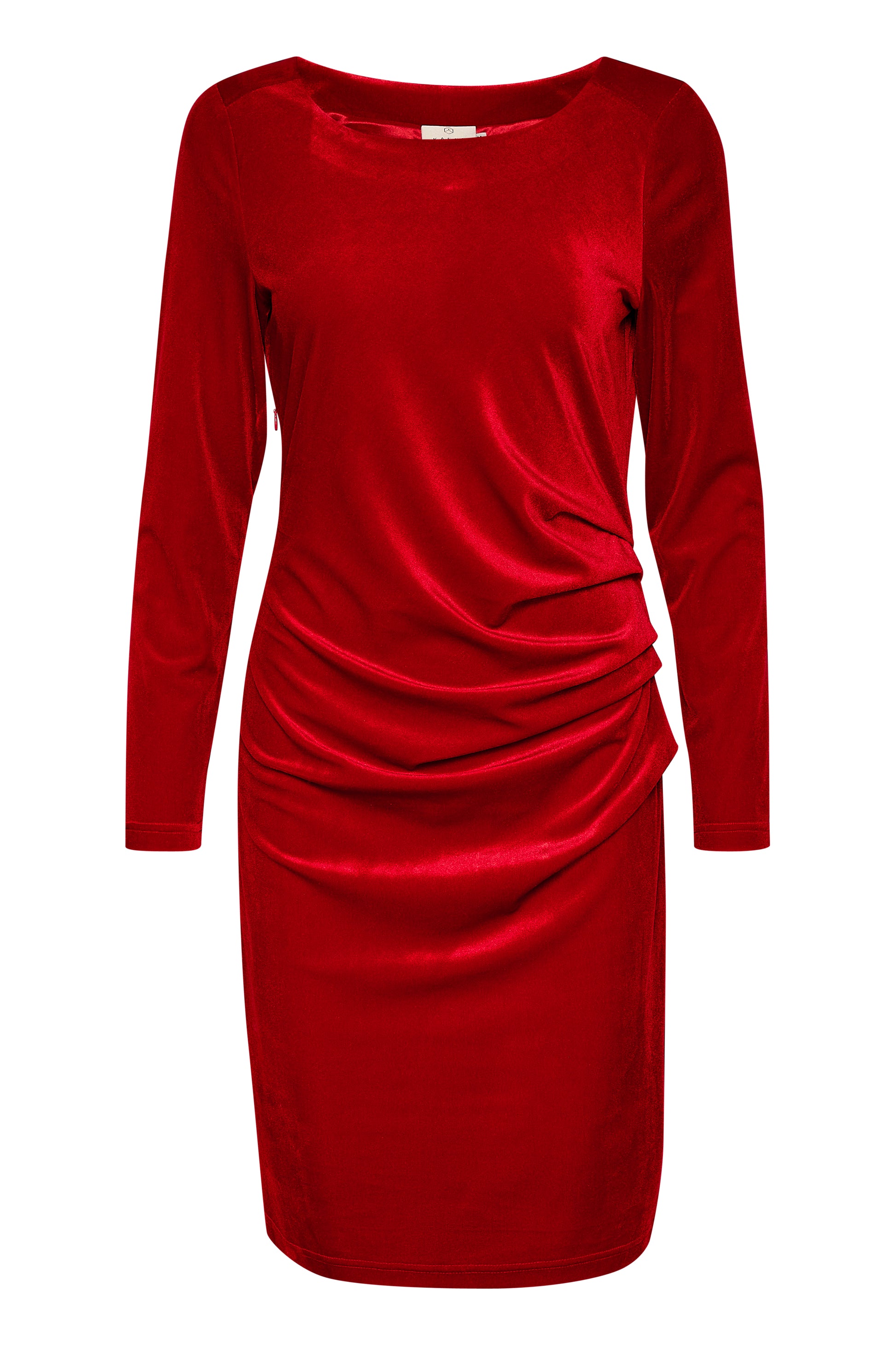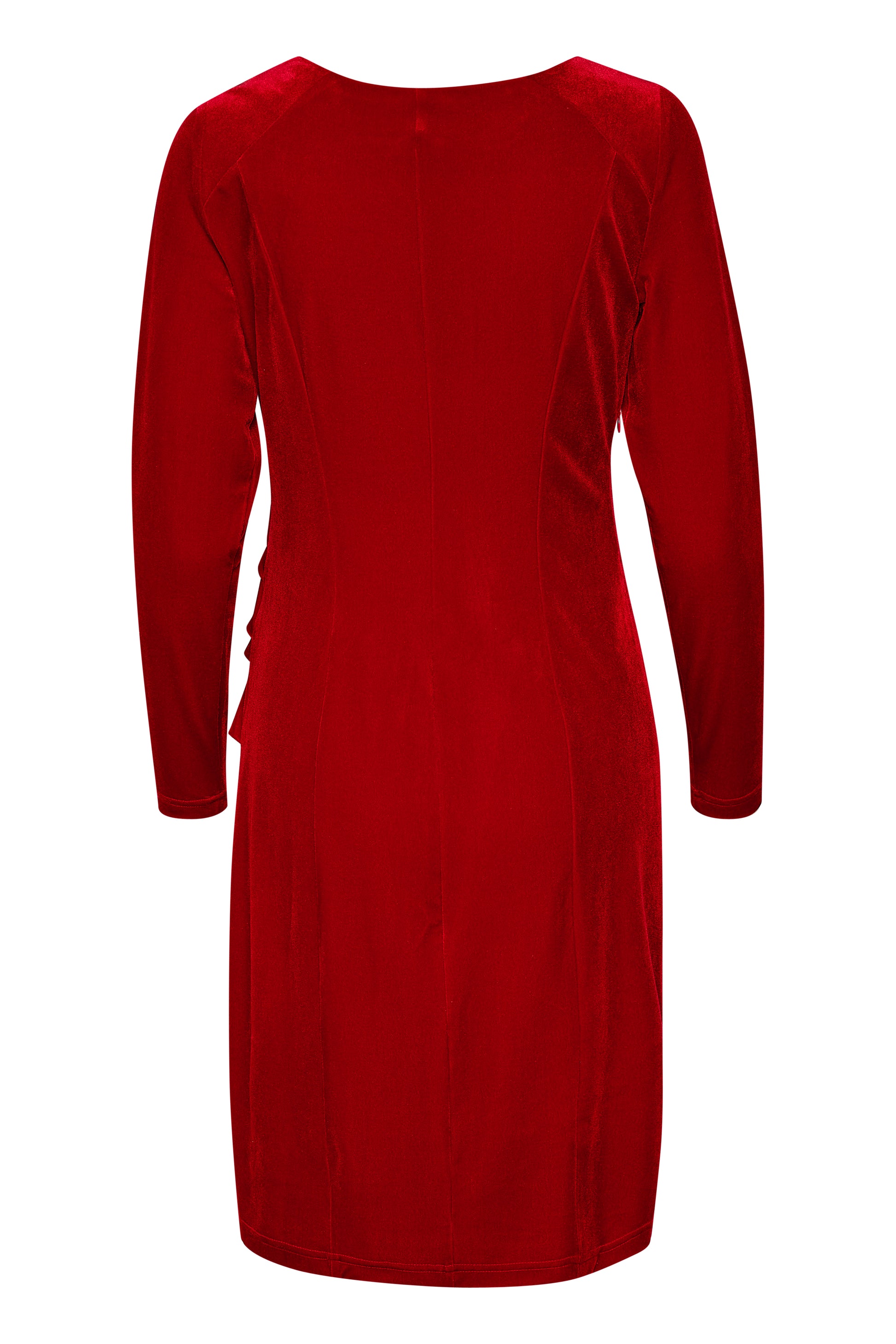 Ihastuttava cocktail-mekko pehmeässä sametissa (velour). Edessä on kauniit laskostukset, ja selkäpuolella prinsessasaumat sekä viistot olkasaumat tuovat istuvuutta. Mekossa on pitkä, kapeasti istuva hiha sekä venekaulus. Pituus yltää juuri polven yläpuolelle — yksinkertainen mutta näyttävä valinta juhlaan tai illanviettoon.