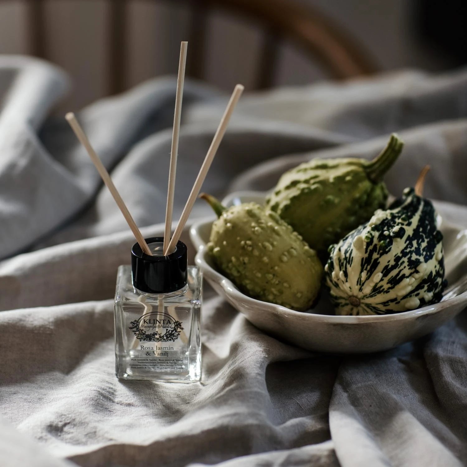 Klintan Scented Sticks -tuoksut perustuvat soijapavun öljyyn, joka on helposti viljeltävä ja nopeasti kasvava, täysin uusiutuva papu. Sitten lisätään joko eteeristä öljyä tai tuoksuöljyä.