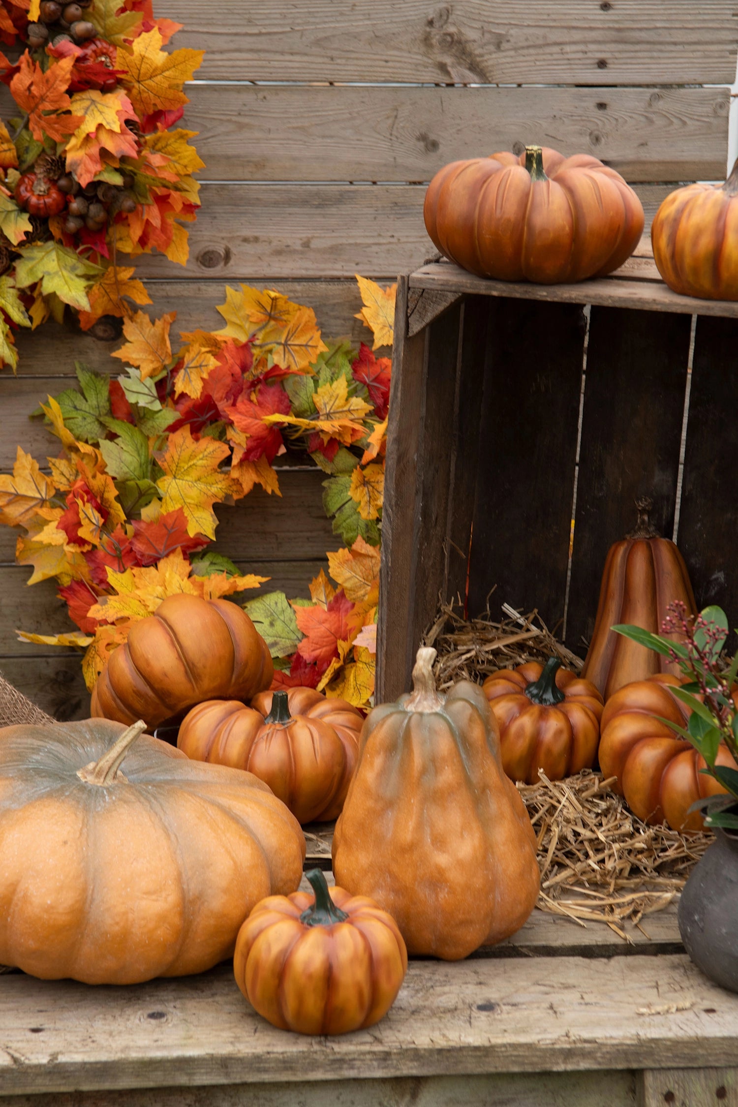 Luo lämpimän syystunnelman kotiin tai myymälään tällä oranssin pitkänomaisella polykurpitsalla. Valmistettu polyesterimateriaalista, joka säilyttää muotonsa ja värinsä vuodesta toiseen.