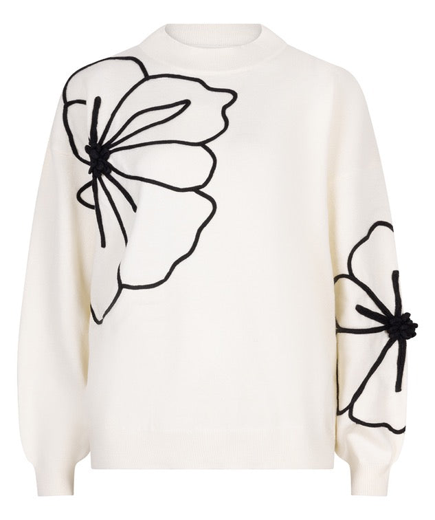 Yksinkertaisen kaunis neule, jossa rinnuksella ja hihassa kauniit kukat kirjailtuna. Neuleessa myös kaunis reilumpi hiha.