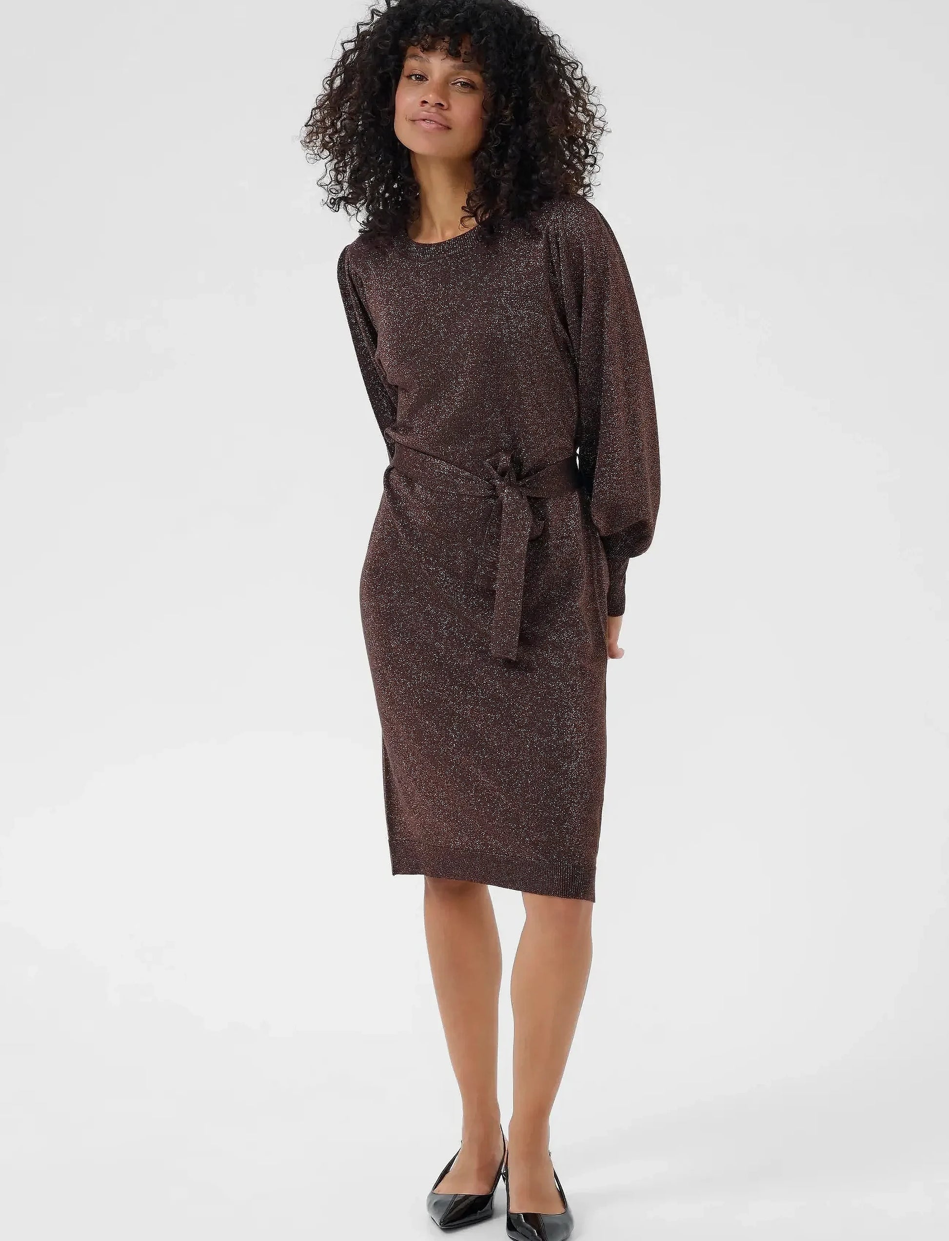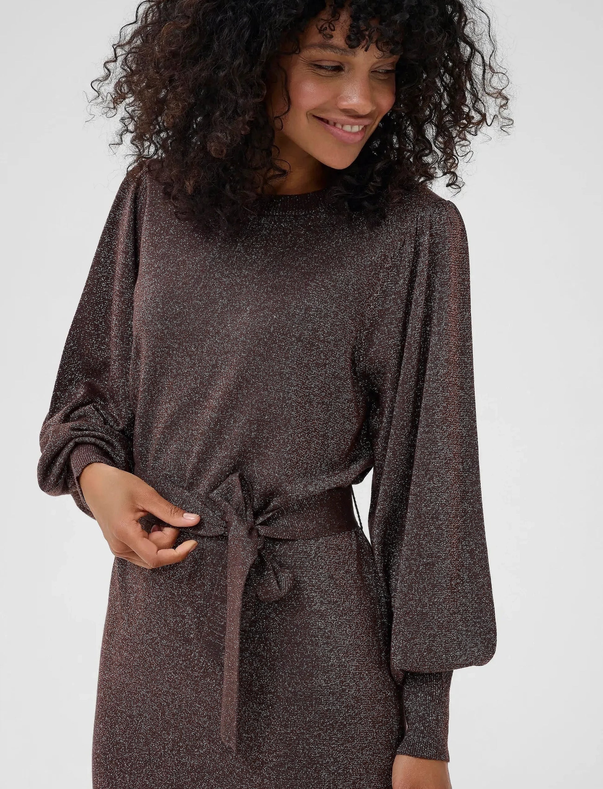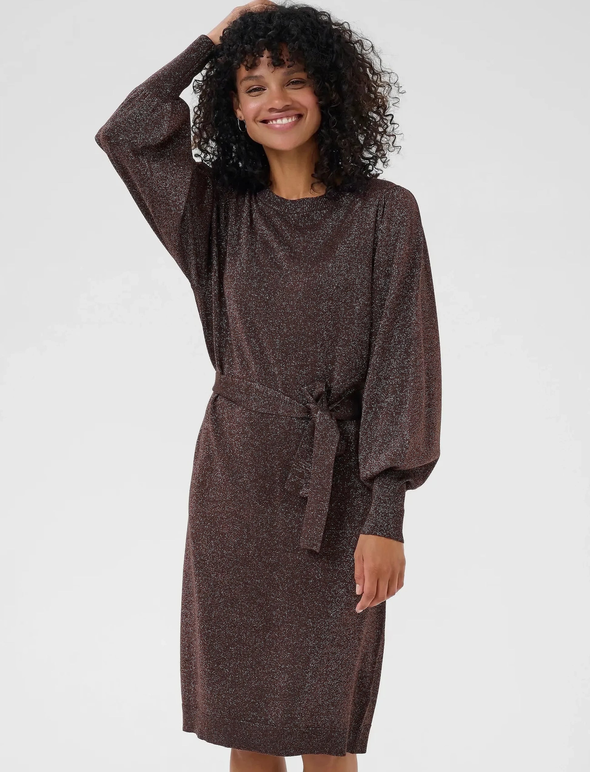 Tässä kaunis neulemekko talven juhliin. Mekossa on todella kauniit puhvihihat, jossa hihansuissa leveä resori. Mekossa on myös neulevyö. Mekko on venyvää materiaalia.