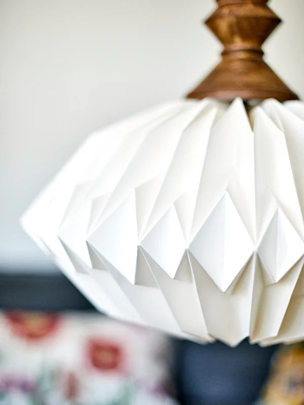 Vanilla Flyn riippuvalaisin. Runko on metallia ja mangopuuta, varjostin taiteltua, tukevaa paperia.