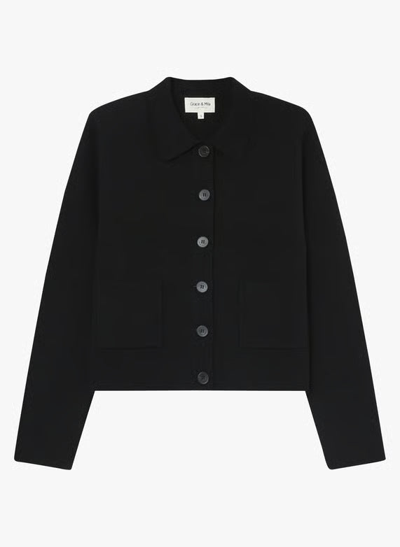 Tämä ryhdikäs neuletakki käy hyvin jakuksi ja tämä on ihanteellinen esim. matkavaatteena koska neule tuntuu pehmeältä, joustaa eikä rypisty käytössä. Neuleessa on edessä taskut ja nappi kiinnitys. Neuleeseen on saatavilla myös housut.