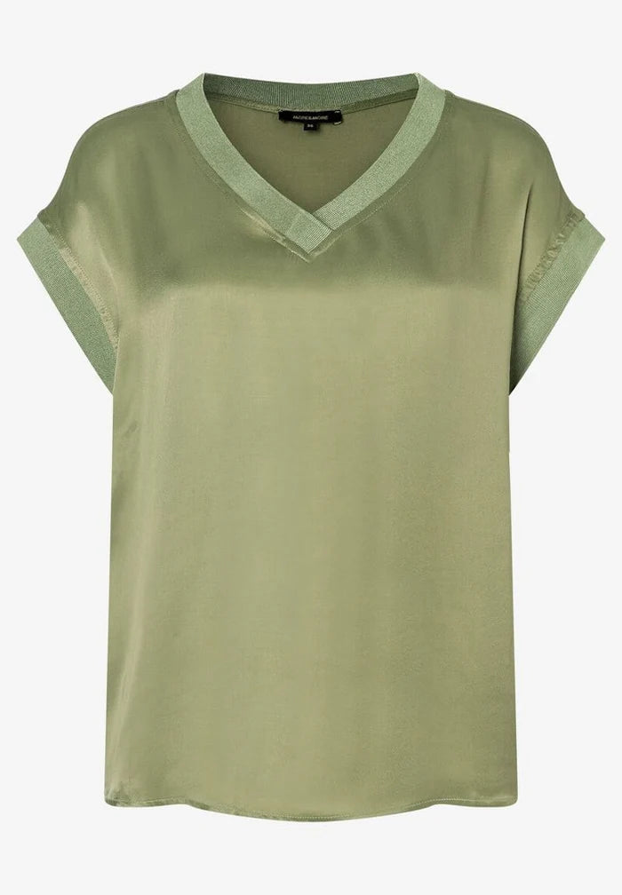 Kaunis satiininen oliivinvihreä t-paita. Paidassa on upeat yksityiskohdat ja rento leikkaus.