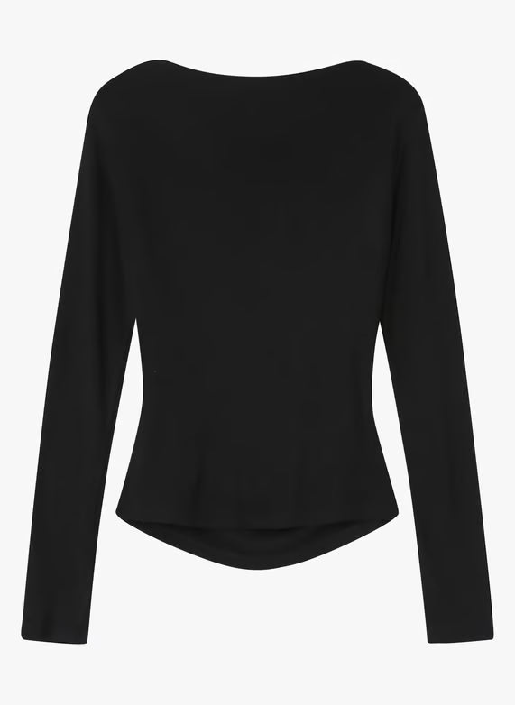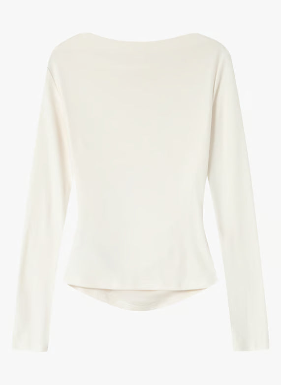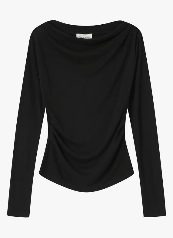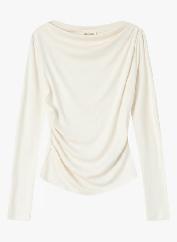 Tässä tukeva pehmeä ribbineulos paidan sivuilla kauniit rypytykset, jonka ansiosta paita istuu kauniisti päälle ja myös tuntuu mukavalta päällä. Paidassa on venepääntie ja se on hieman pidempää mallia.