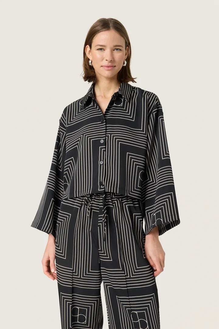 Crop-mallinen paita leveillä hihoilla ja kauluksella. Yhdistä samaa kuosia olevien housujen kanssa!