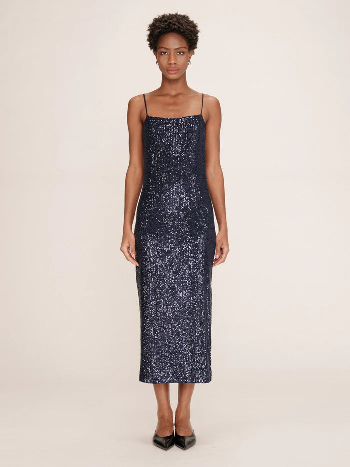 Juhlava tummansininen paljettimekko. Mekossa on säädettävät spagettiolkaimet. Mekko on suoran mallinen ja reisipituinen. Täydellinen esimerkiksi pikkujouluihin.