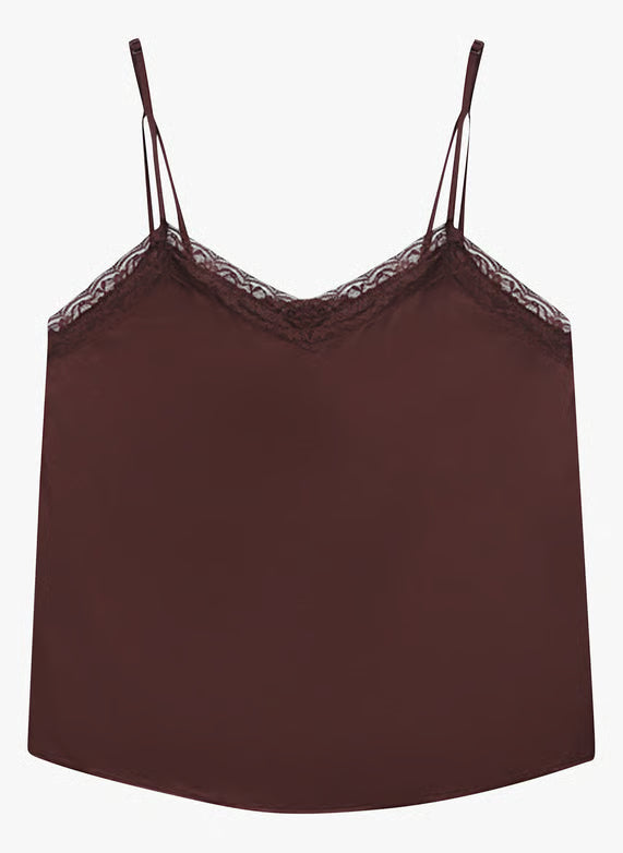 Ruskea satiininen toppi, jonka yläreunassa on pitsireunus. Topissa on säädettävät spagettiolkaimet. Toppi on A-linjainen, mikä takaa yhdessä säädettävien olkainten kanssa istuvuuden monenlaisille kehoille.
